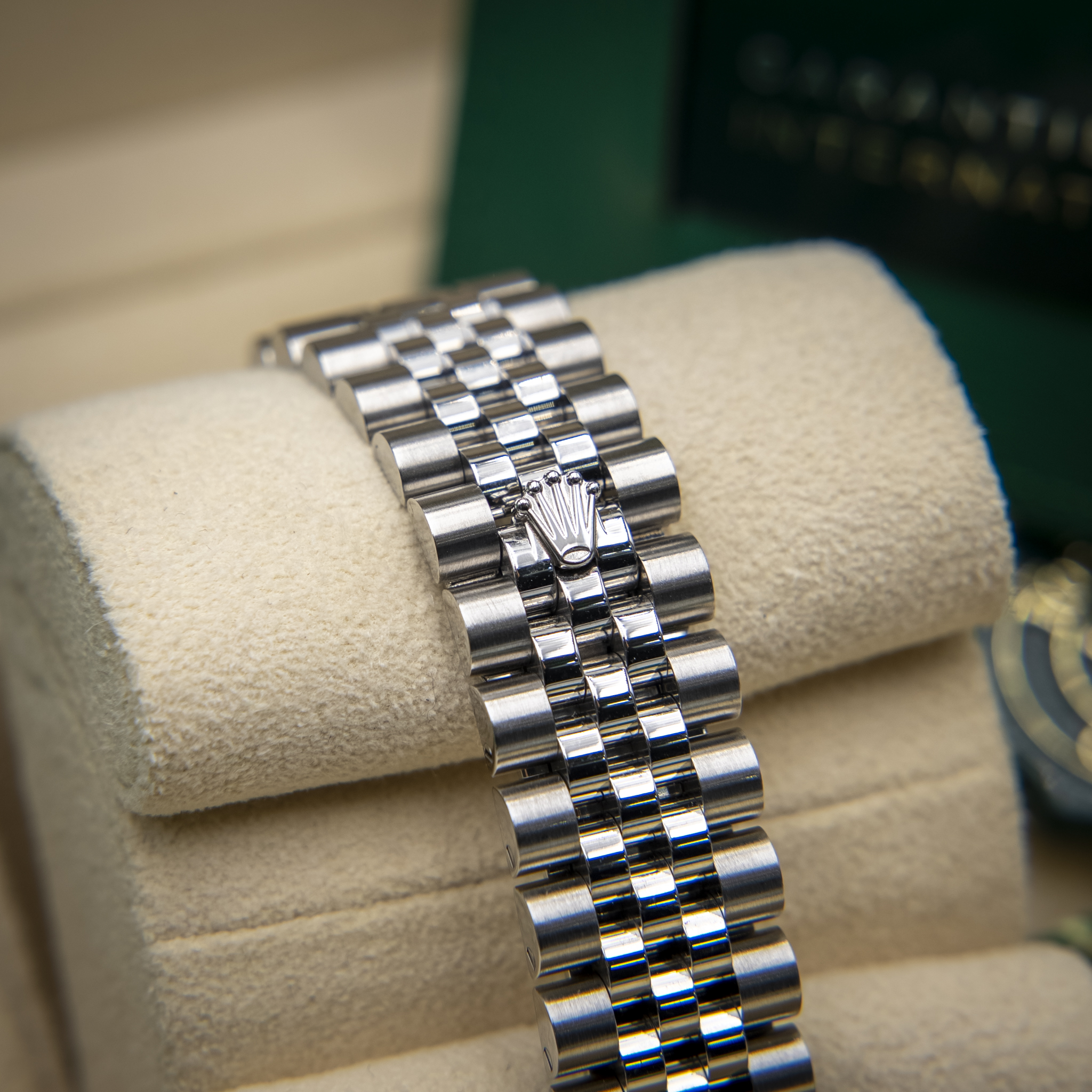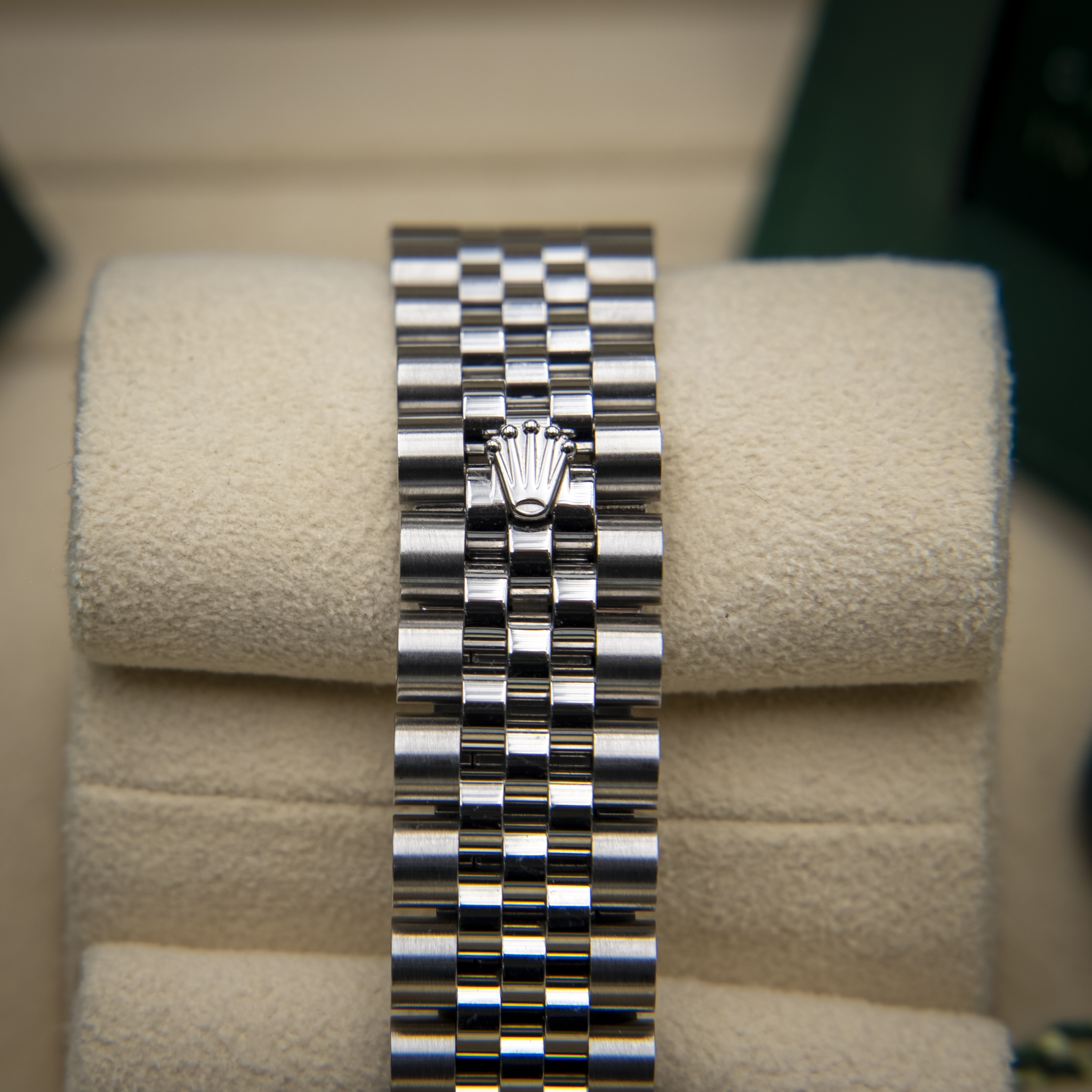 Al igual que sucede con los demás componentes del reloj, los controles estéticos realizados por nuestros expertos garantizan una belleza impecable. El Jubilee, un brazalete fluido y confortable de eslabones de cinco elementos de metal, se creó específicamente para el lanzamiento del modelo Oyster Perpetual Datejust en 1945.