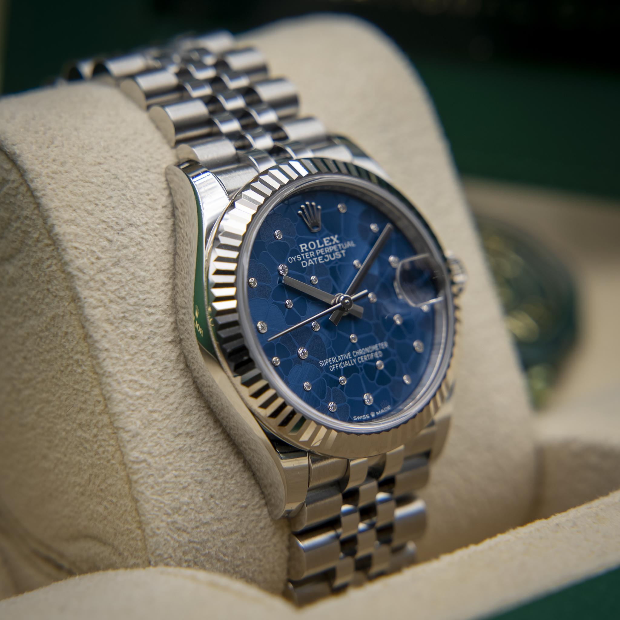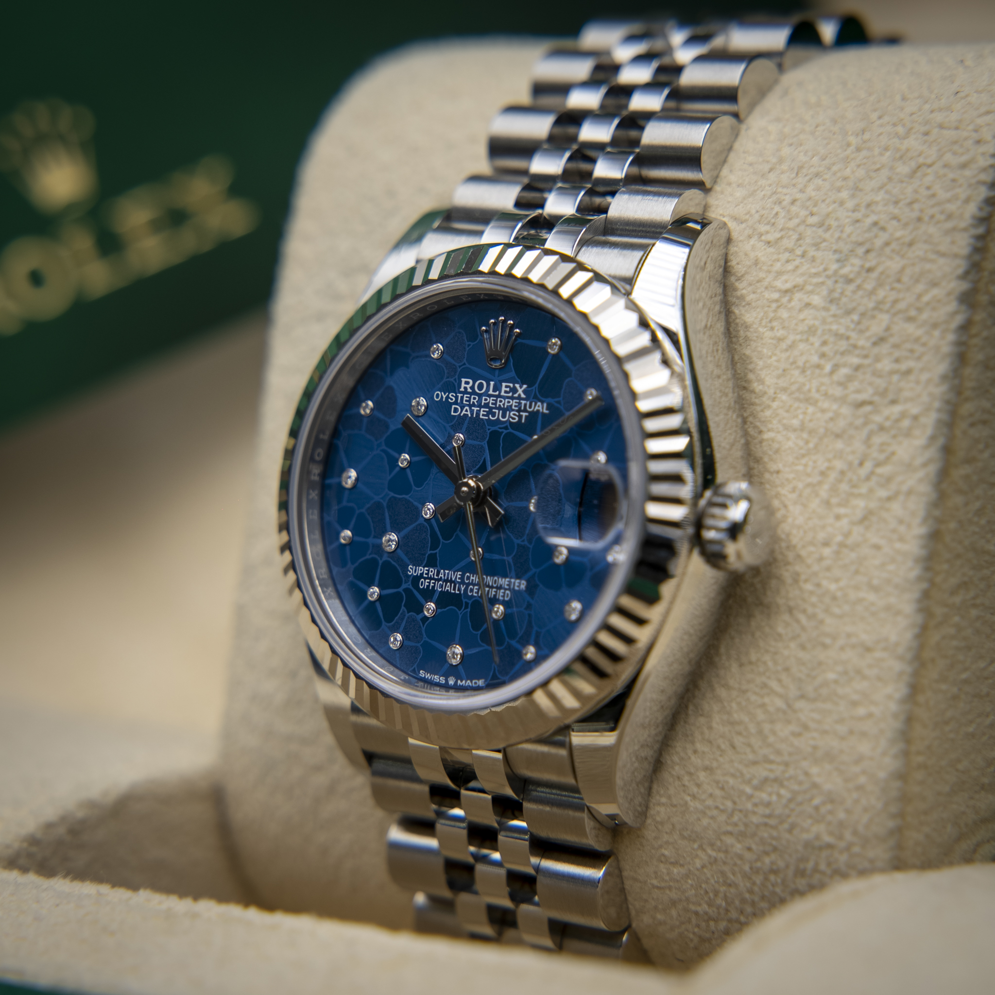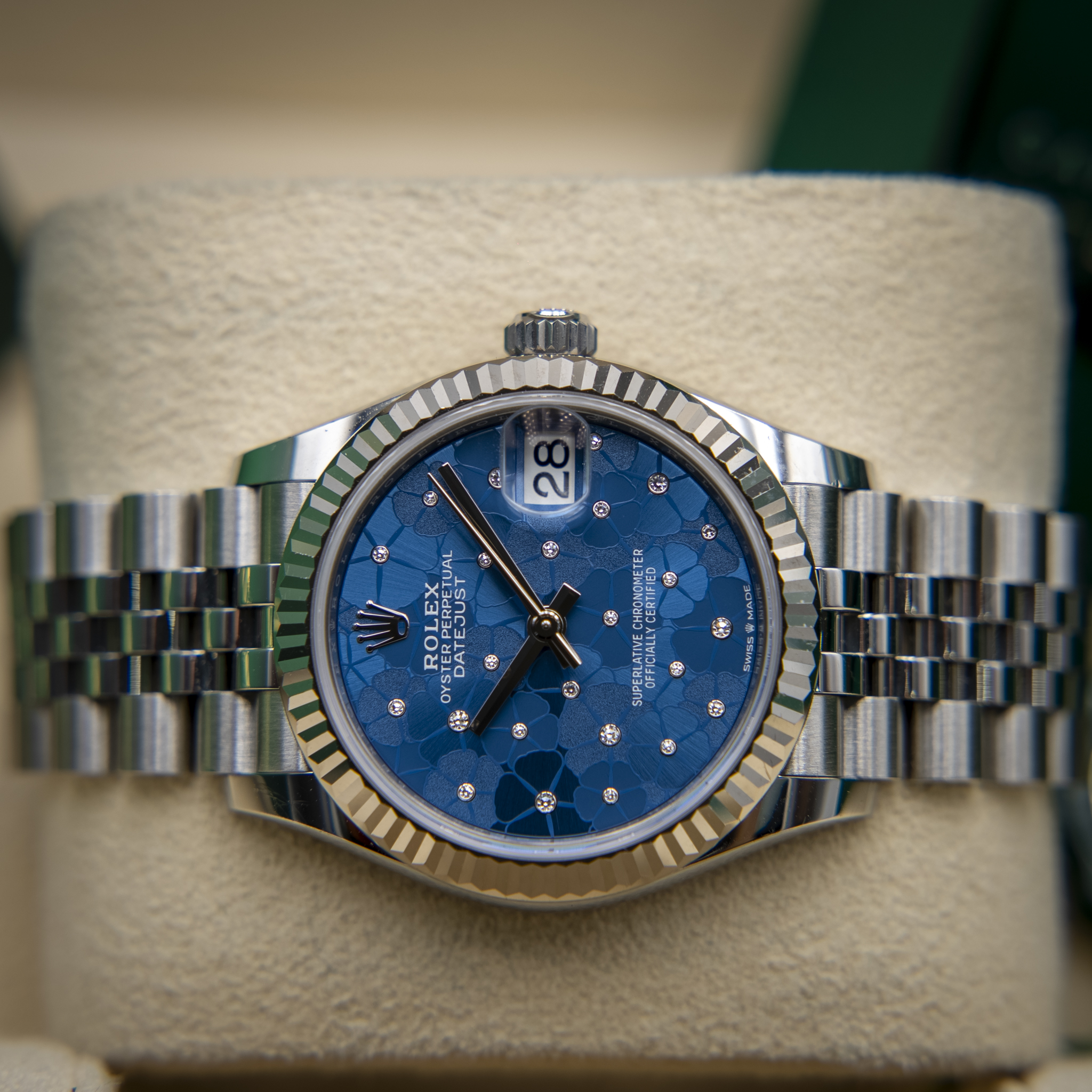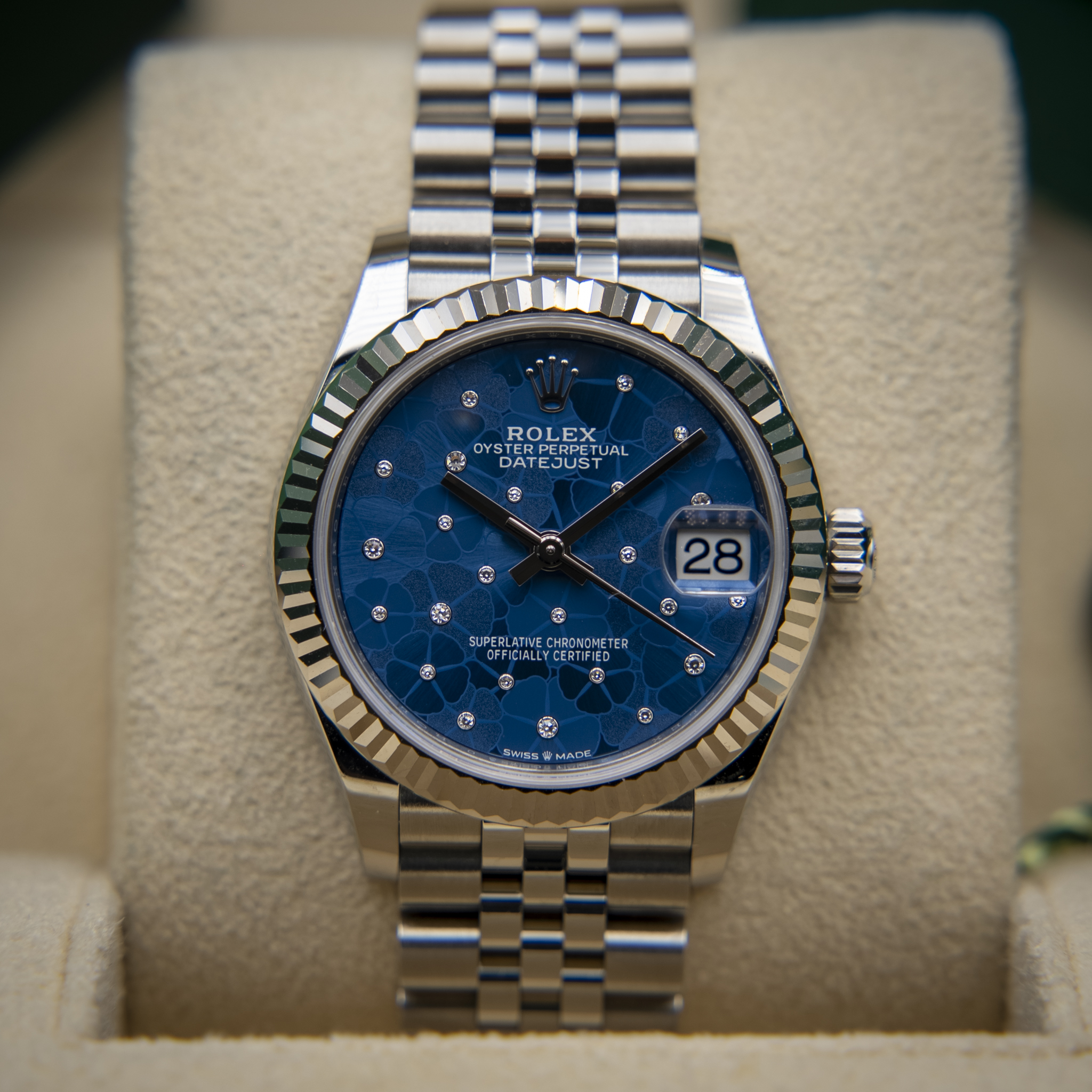 Este Oyster Perpetual Datejust 31 en acero Oystersteel y oro blanco presenta una esfera azul vivo y un brazalete Jubilee.