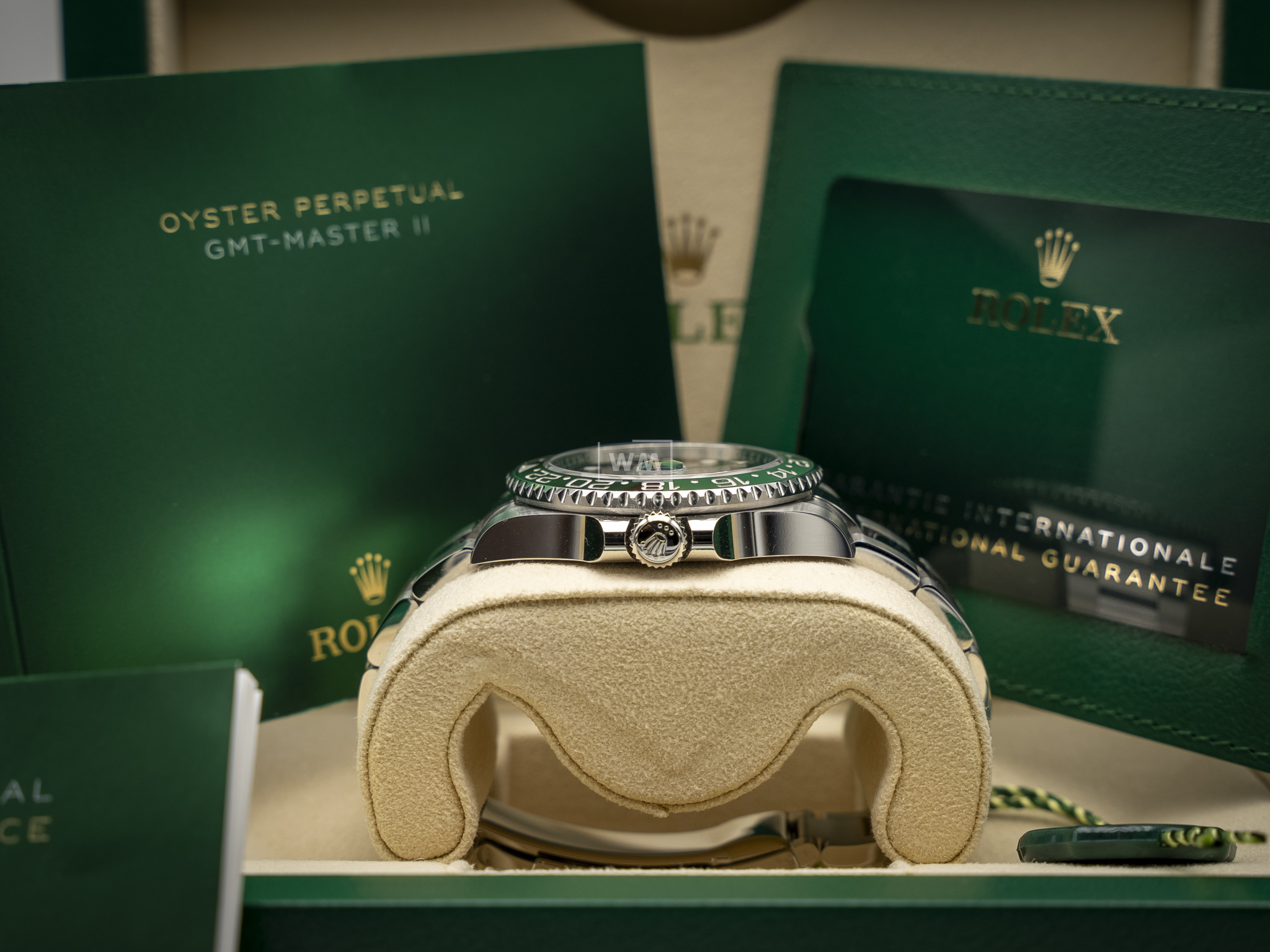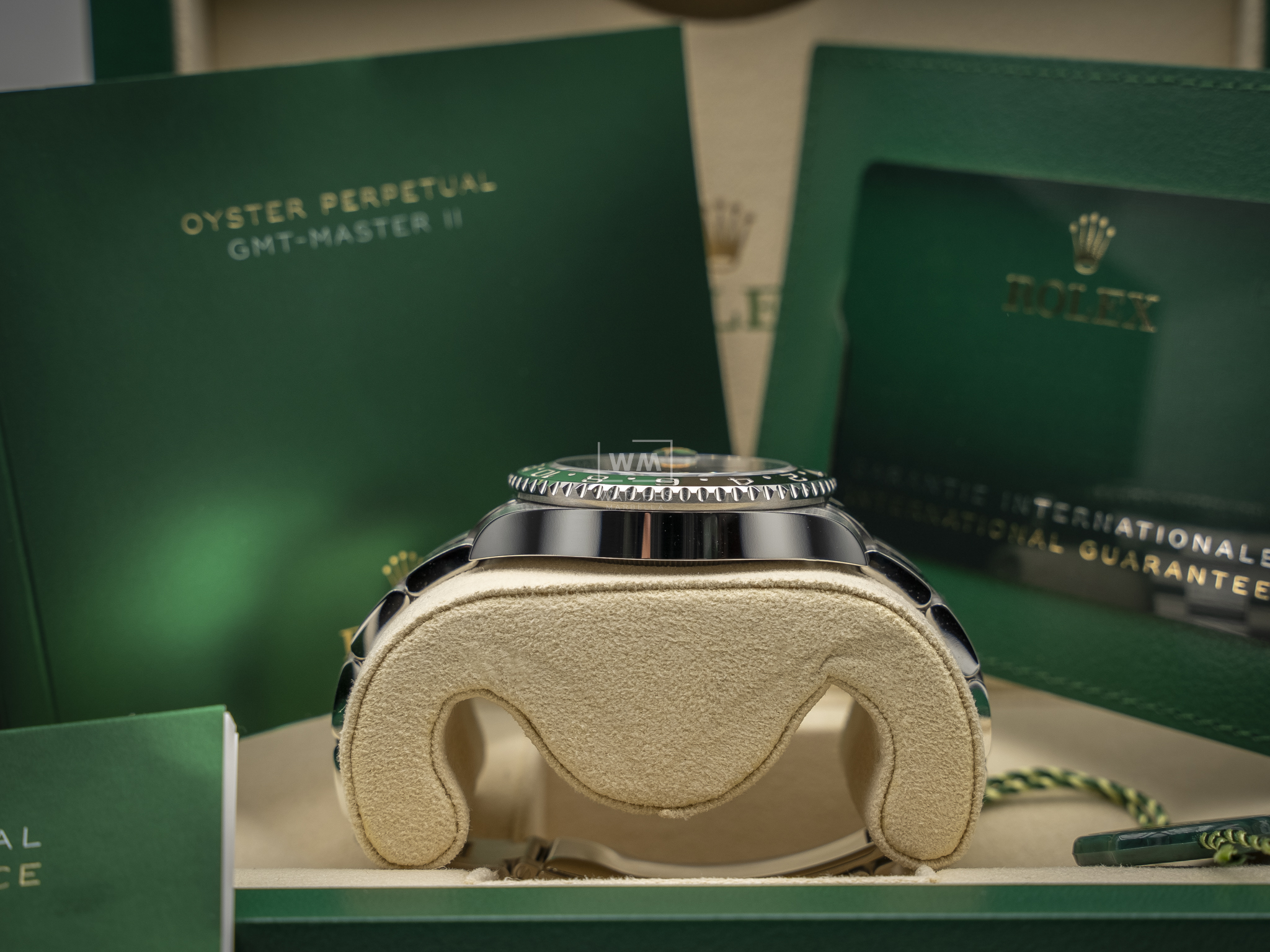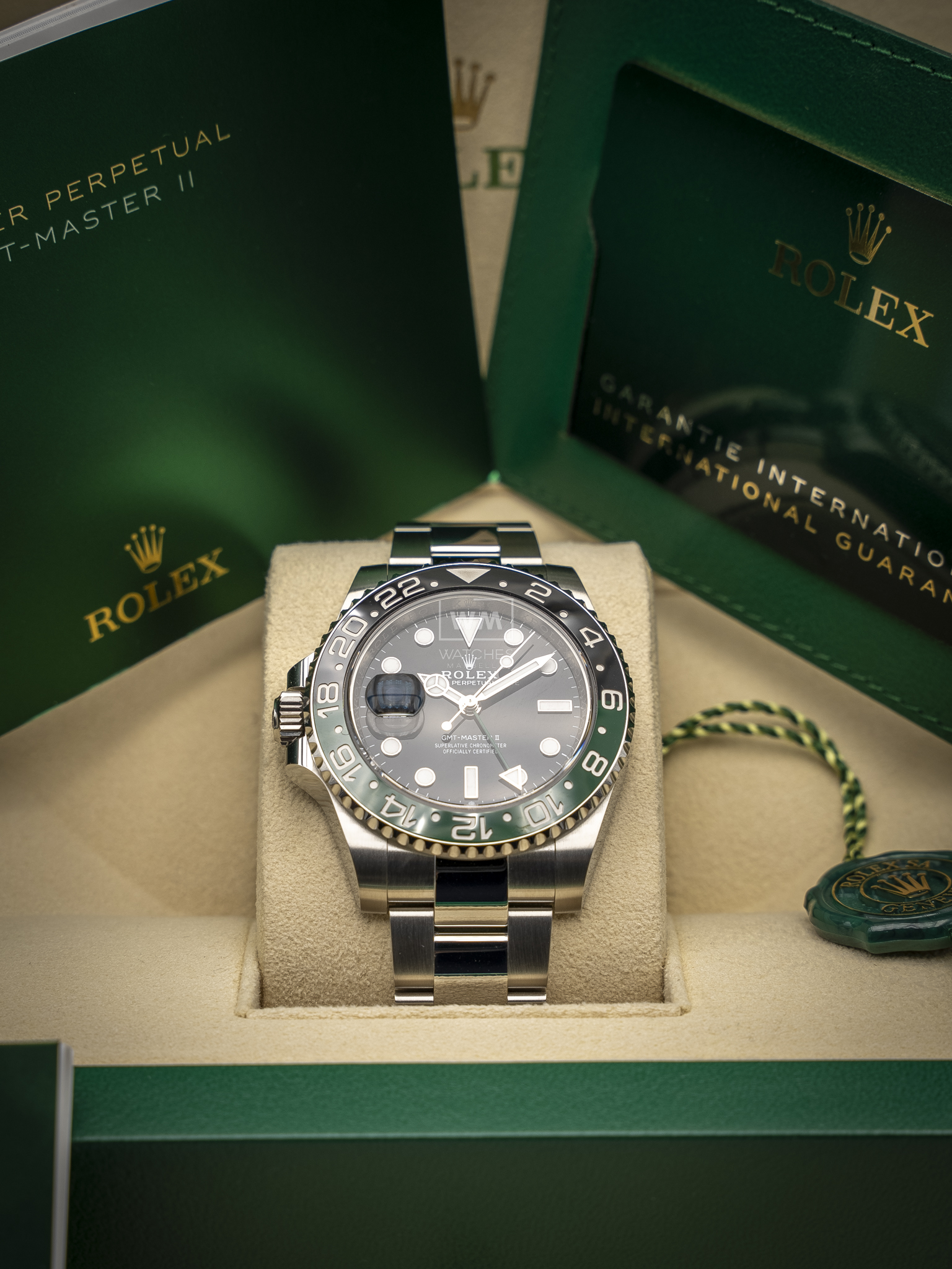 Este modelo presenta una esfera negra y un disco de bisel Cerachrom bicolor en cerámica verde y negra bicolor. El GMT‑Master II dispone de una aguja adicional que da la vuelta a la esfera en 24 horas y complementa a las tradicionales agujas de las horas, minutos y segundos, así como de un bisel giratorio bidireccional graduado 24 horas.