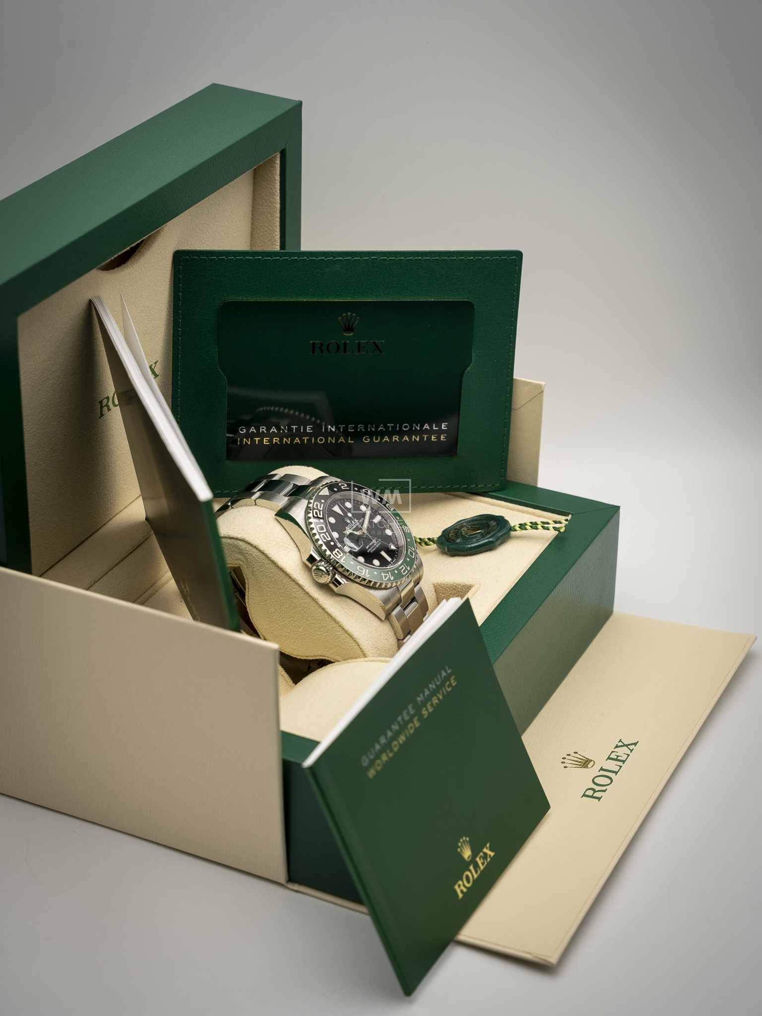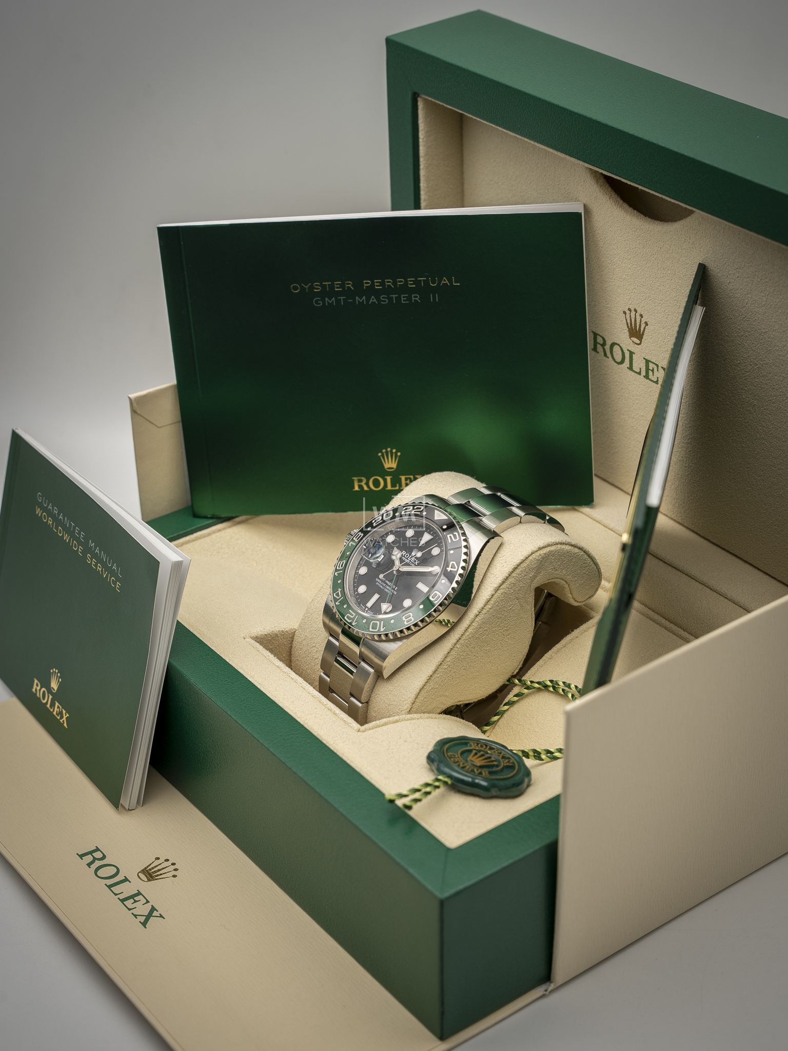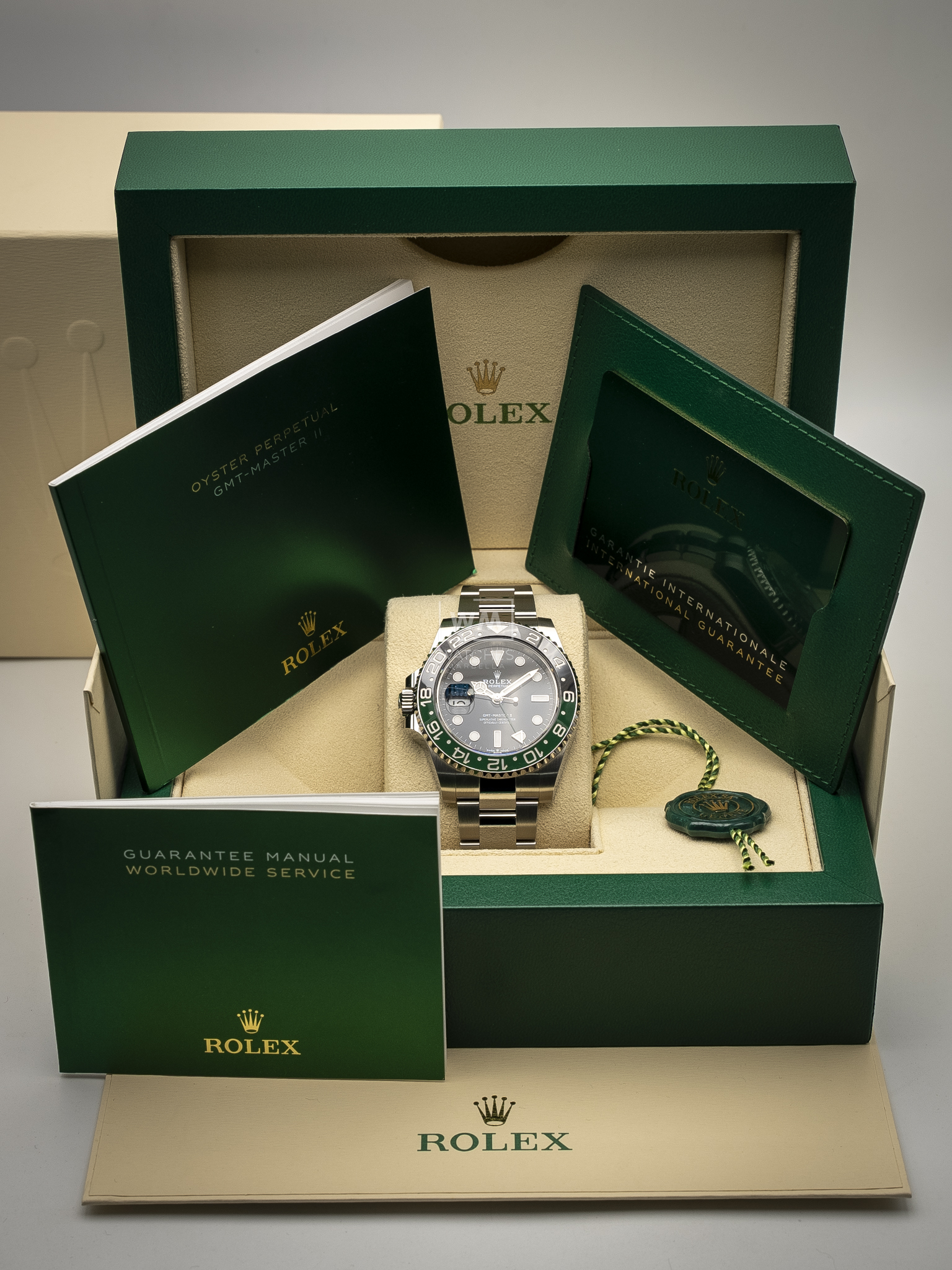 Este modelo presenta una esfera negra y un disco de bisel Cerachrom bicolor en cerámica verde y negra bicolor. El GMT‑Master II dispone de una aguja adicional que da la vuelta a la esfera en 24 horas y complementa a las tradicionales agujas de las horas, minutos y segundos, así como de un bisel giratorio bidireccional graduado 24 horas.