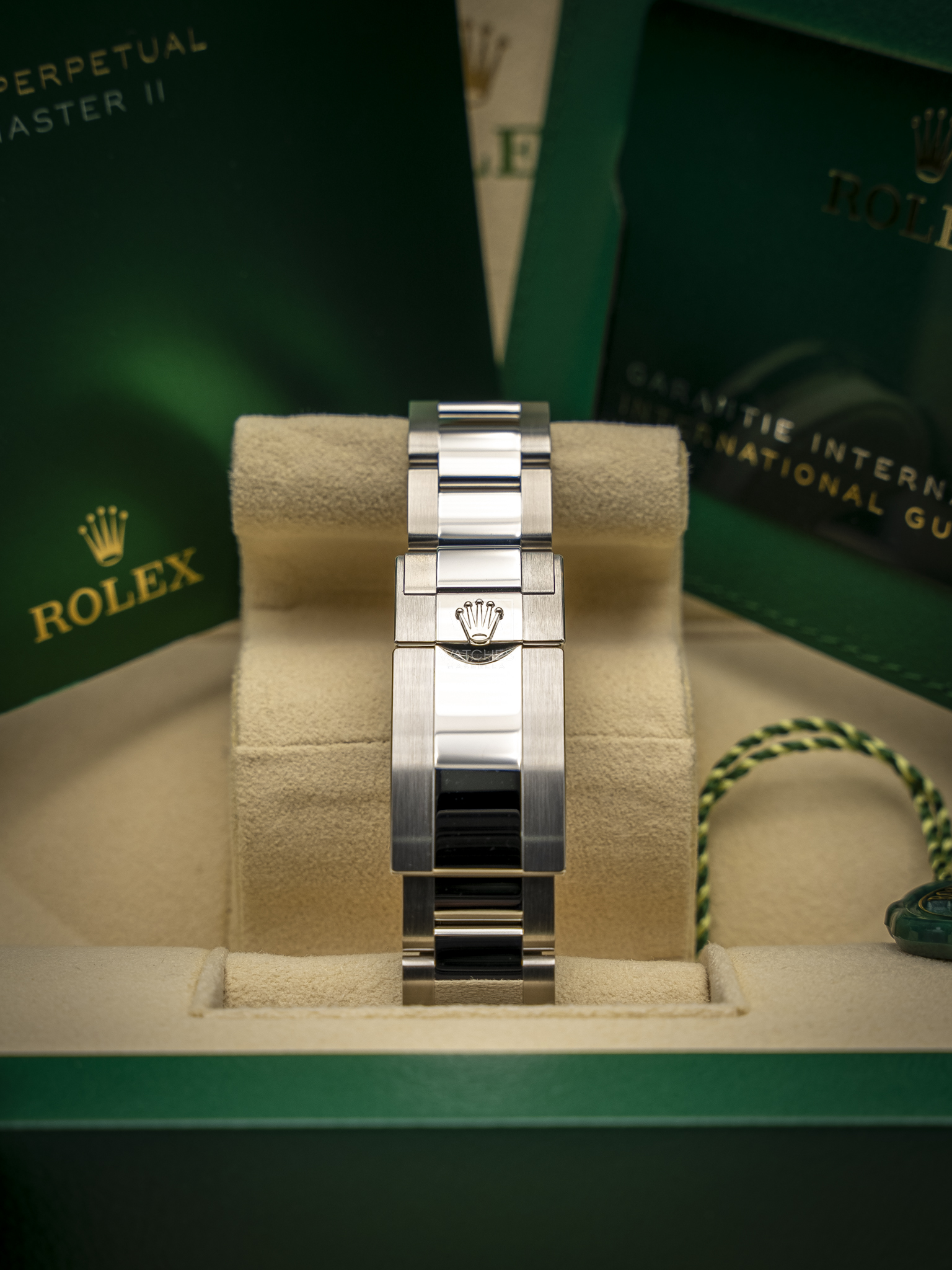 El brazalete Oyster es fruto de una alquimia perfecta entre forma y función, estética y técnica, diseñado para ser a la vez robusto y confortable. Está equipado con un cierre desplegable Oysterlock que evita cualquier apertura accidental, y cuenta con un cómodo sistema de extensión rápida Easylink, otra característica exclusiva de Rolex.