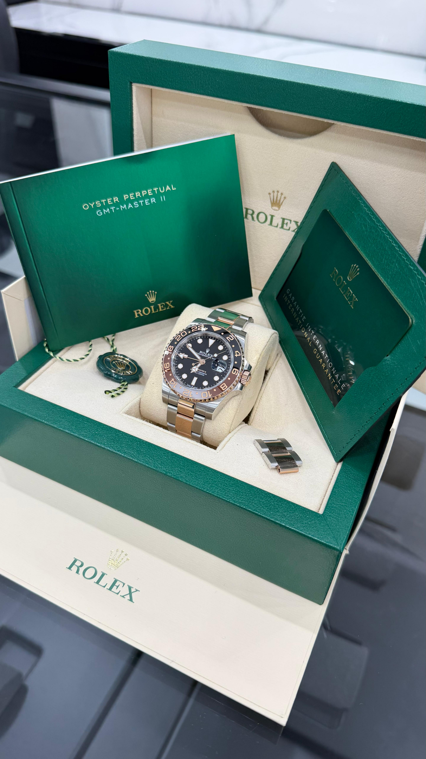 Este modelo presenta una esfera negra y un disco de bisel Cerachrom bicolor en cerámica marrón y negra bicolor. El GMT‑Master II dispone de una aguja adicional que da la vuelta a la esfera en 24 horas y complementa a las tradicionales agujas de las horas, minutos y segundos, así como de un bisel giratorio bidireccional graduado 24 horas.