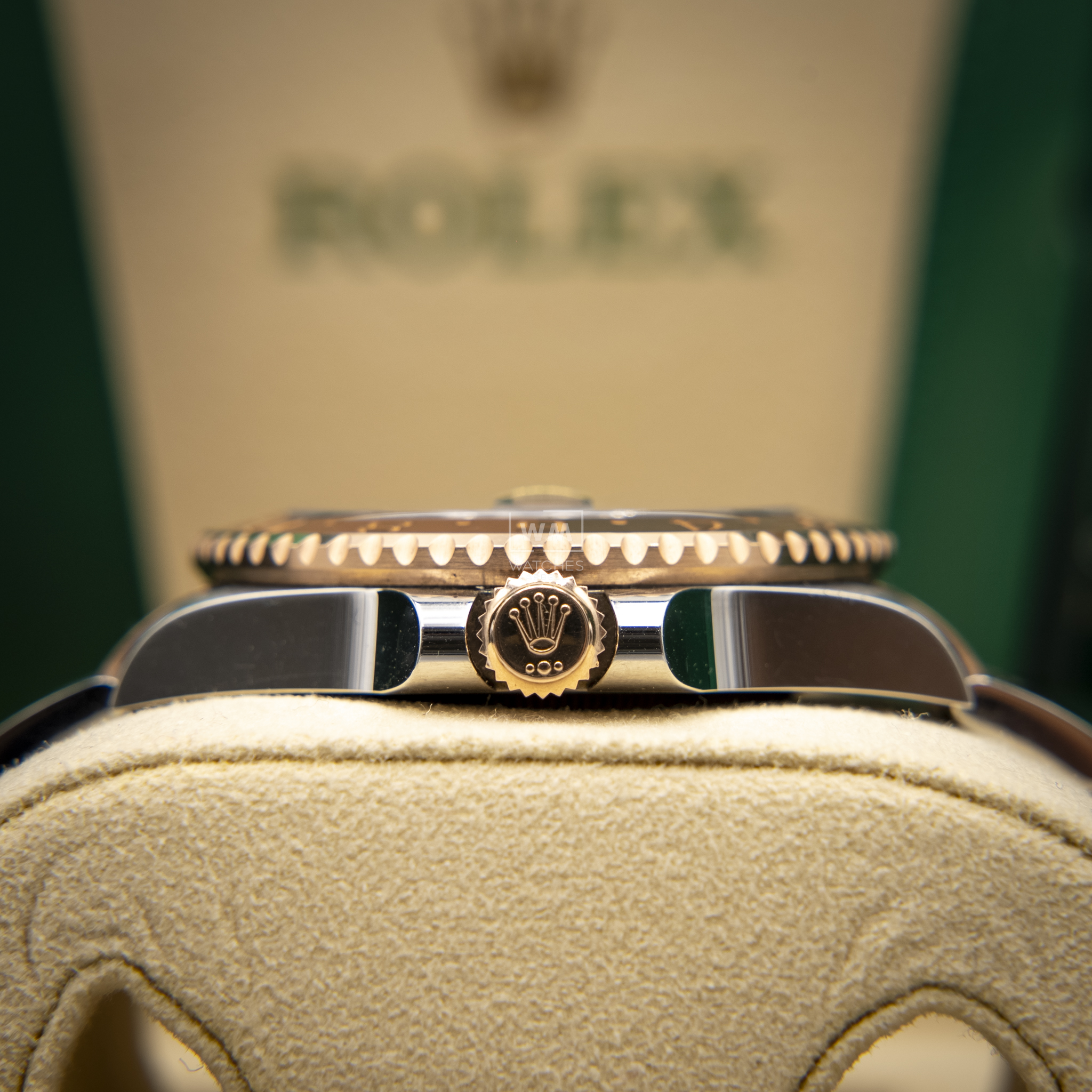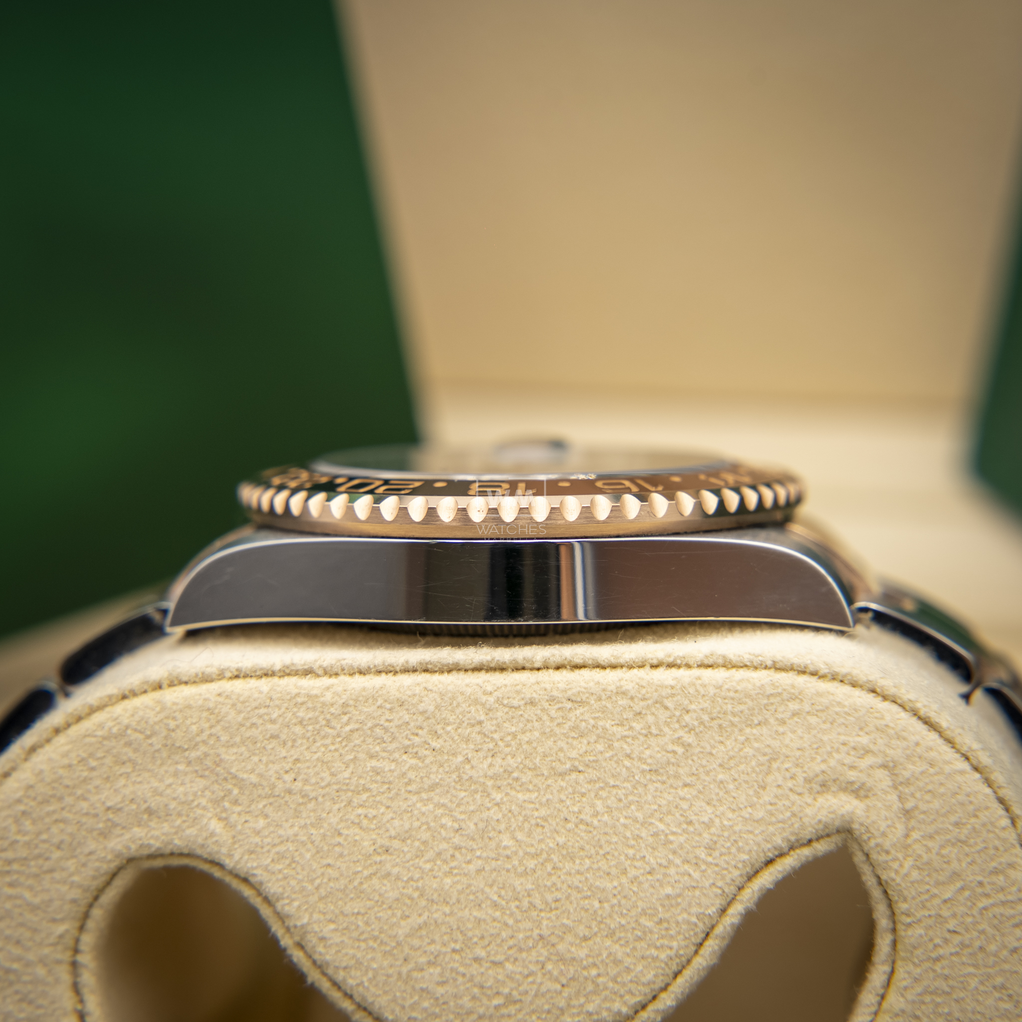 Este modelo presenta una esfera negra y un disco de bisel Cerachrom bicolor en cerámica marrón y negra bicolor. El GMT‑Master II dispone de una aguja adicional que da la vuelta a la esfera en 24 horas y complementa a las tradicionales agujas de las horas, minutos y segundos, así como de un bisel giratorio bidireccional graduado 24 horas.