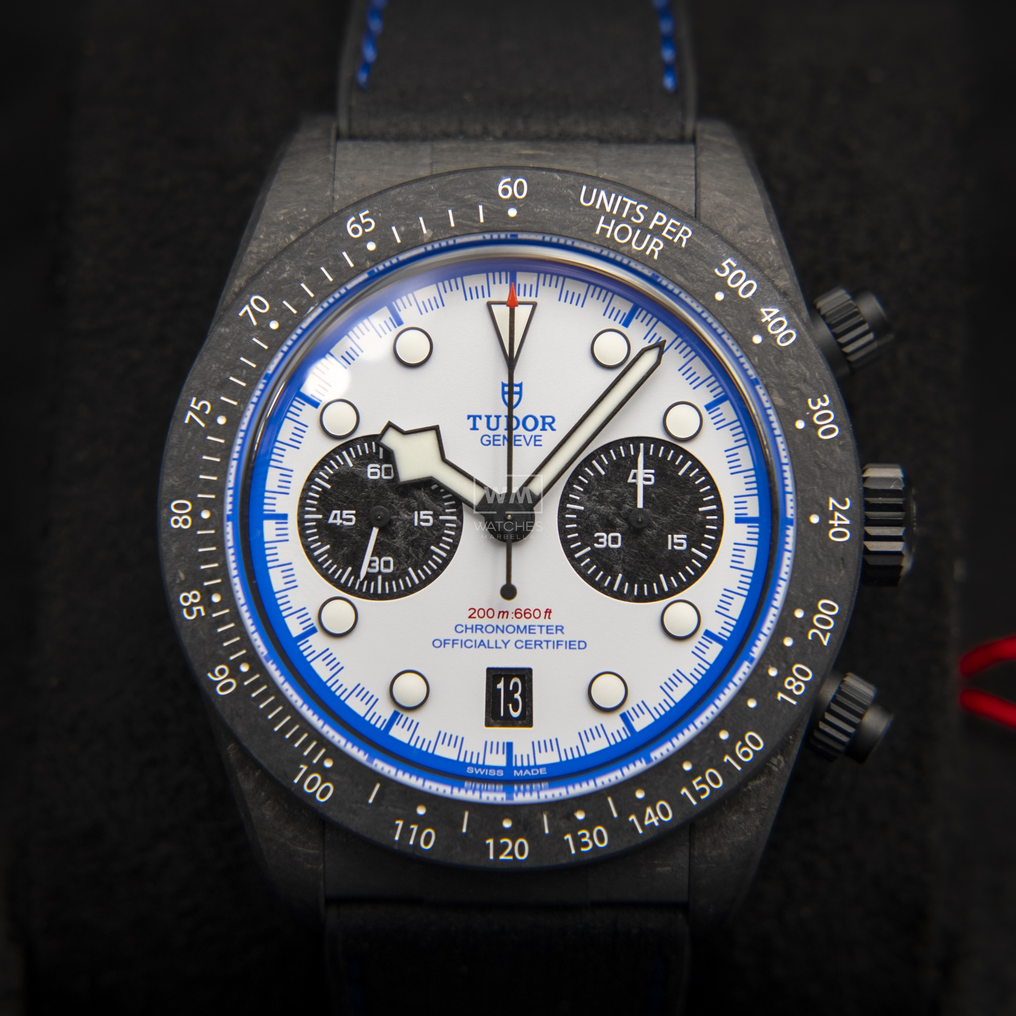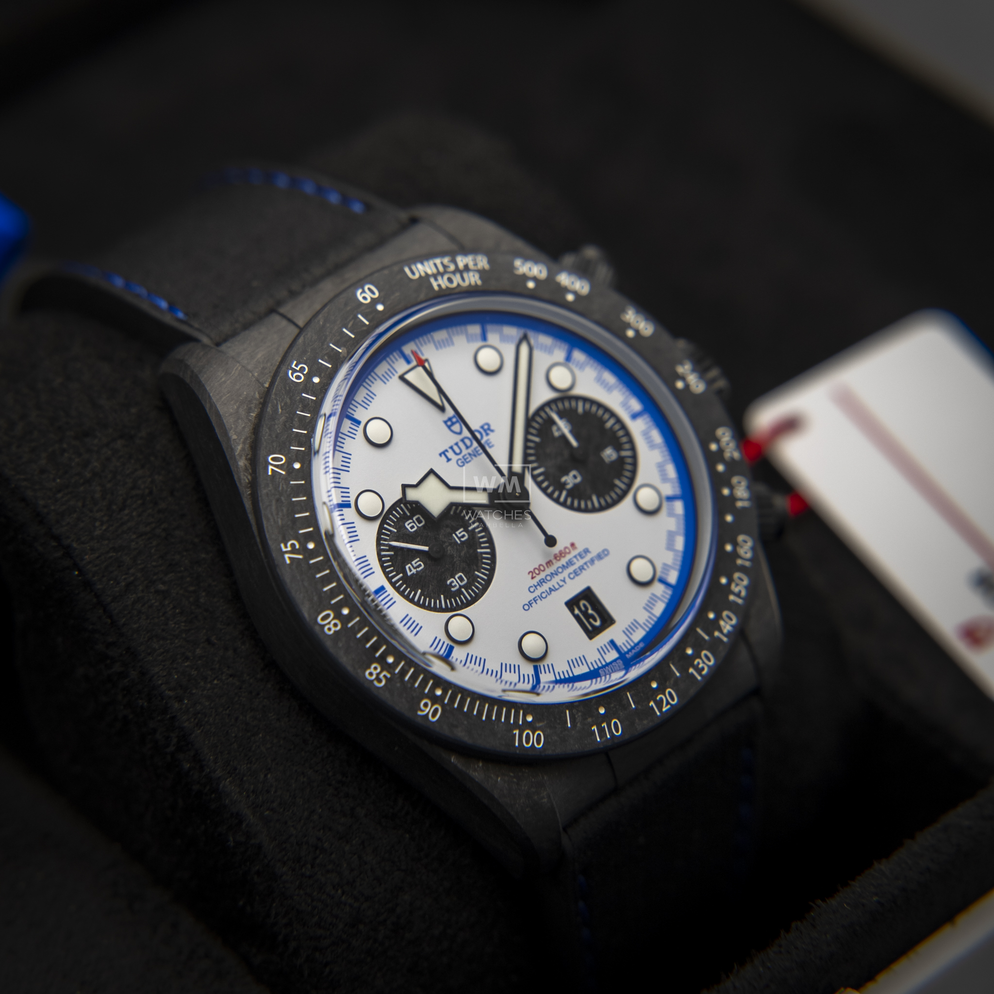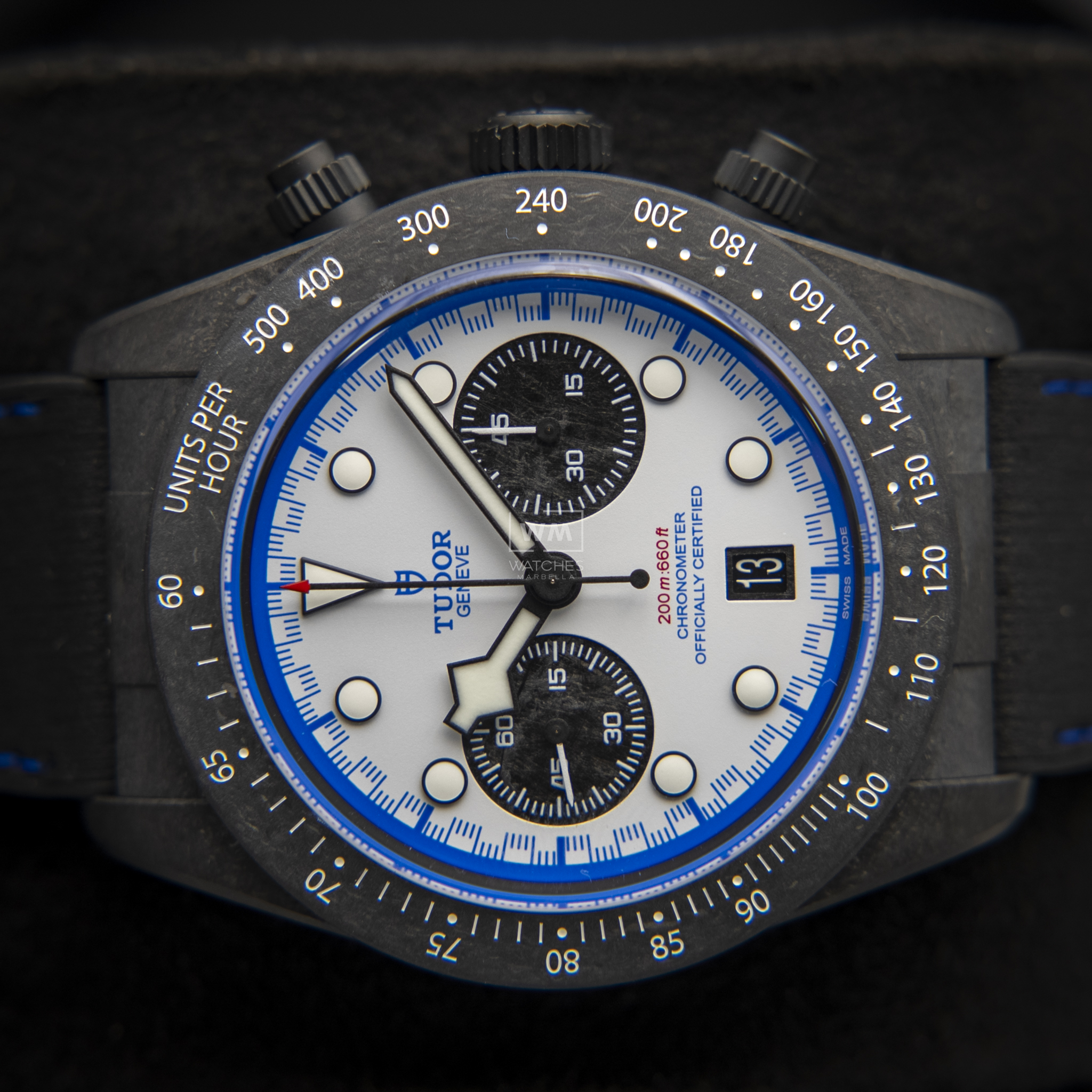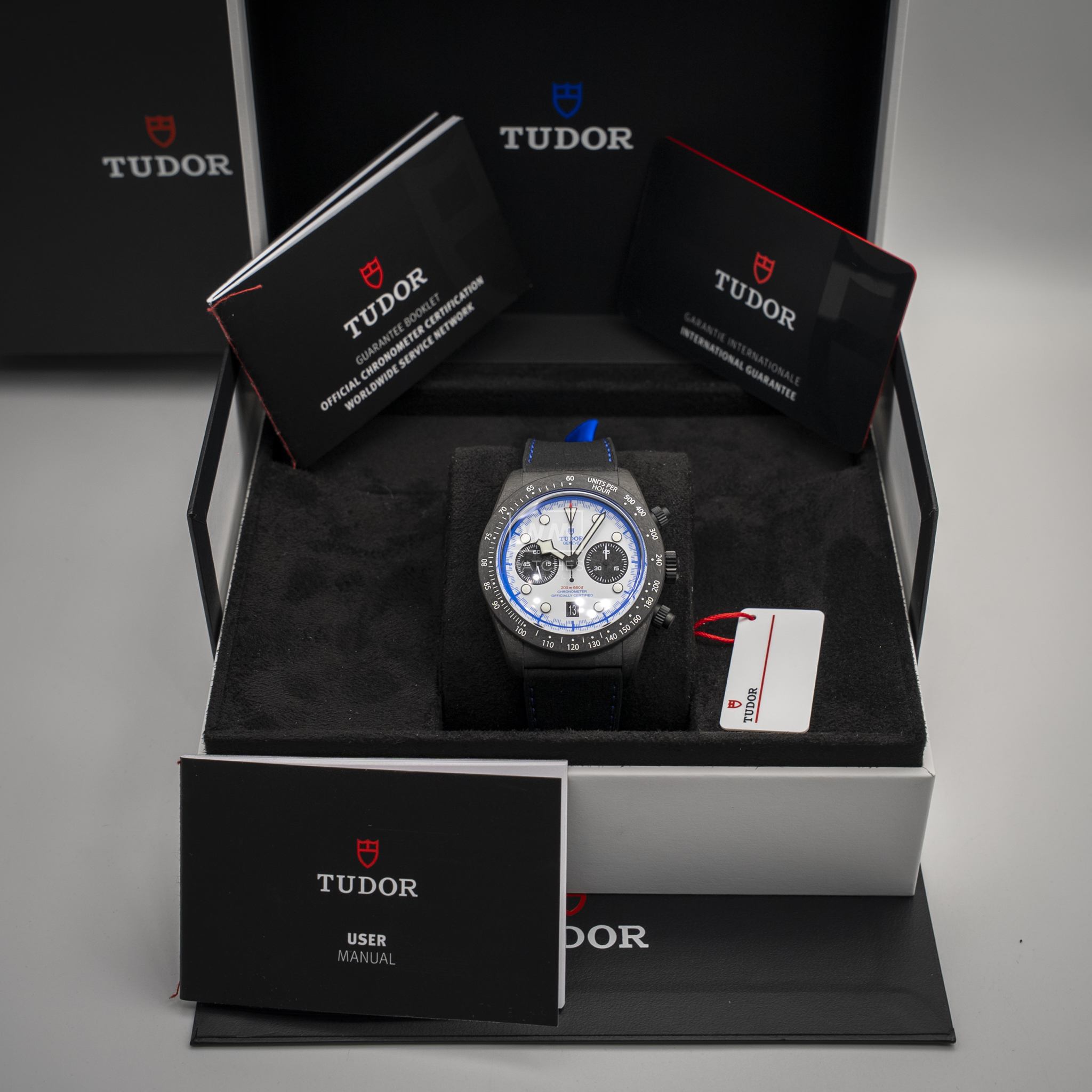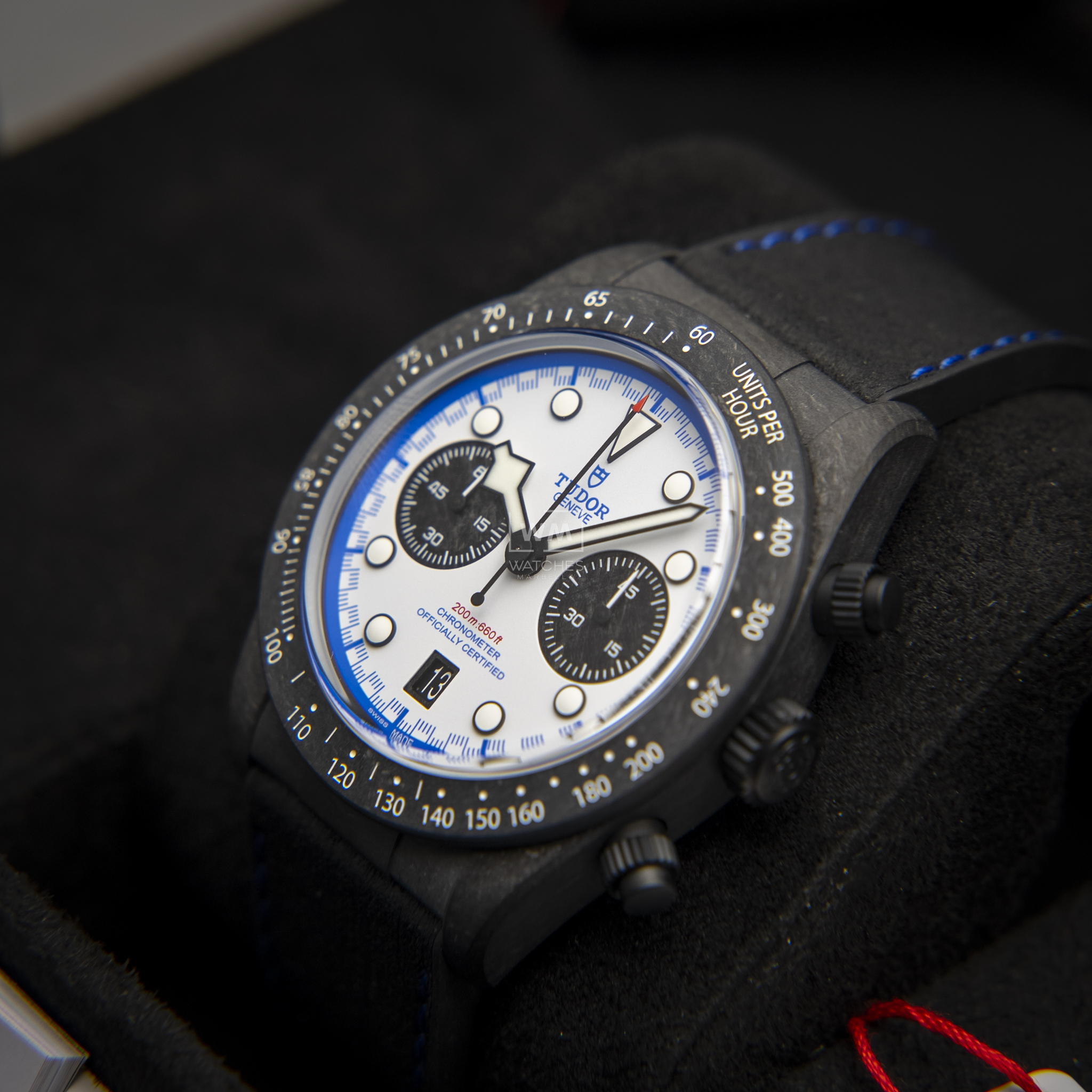 TUDOR ha estado vinculado con el automovilismo desde la década de los 50. El Black Bay Chrono «Carbon 25» —con una caja presentada completamente en fibra de carbono, incluyendo las sujeciones, con pulsadores de titanio— marca una larga tradición de TUDOR que va «rueda a rueda» con las escuderías. Con una caja rediseñada, ligera y tecnológicamente avanzada, un Calibre de Manufactura con rueda de pilares y una estética inspirada en el Visa Cash App Racing Bulls Formula One Team, el Black Bay Chrono «Carbon 25» le da varias vueltas a la competición. Para un toque puramente estético, incluso los subcontadores del cronógrafo son de fibra de carbono.